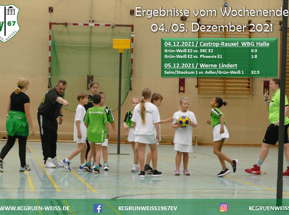 Weiterlesen »Am vergangenen Wochenende fand der letzte E-Spieltag in 2021 statt. Da unsere Mannschaften Grün-Weiß E1 und E3 in der Gruppe B schon durch sind, hatte nur noch unsere E2 Wettkämpfe auf der Agenda. Durch die Absage von Phoenix E2 hatten wir am Samstag, 04. Dezember 2021 lediglich zwei Spiele in der WBG-Halle in Castrop-Rauxel zu bestreiten.